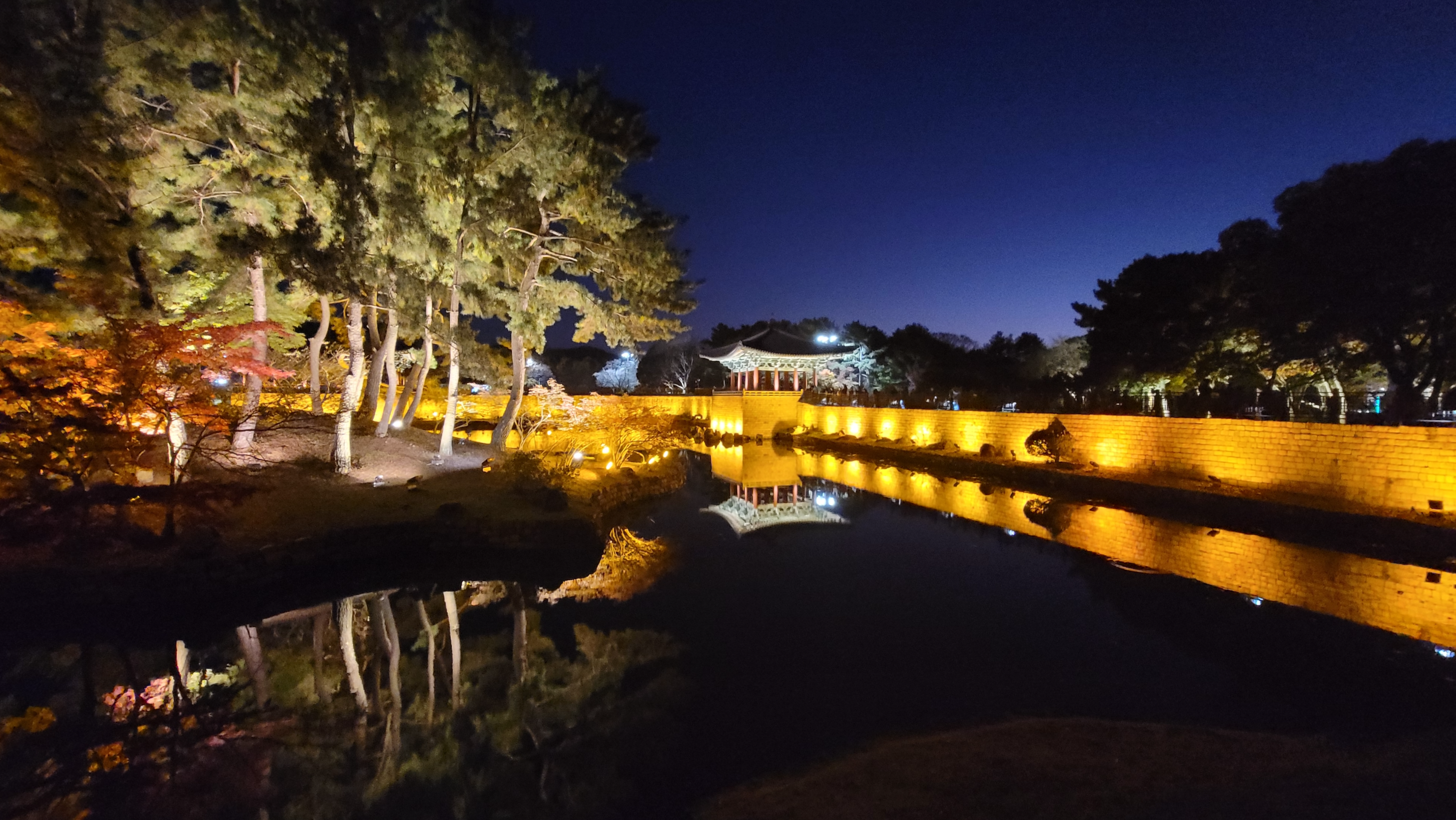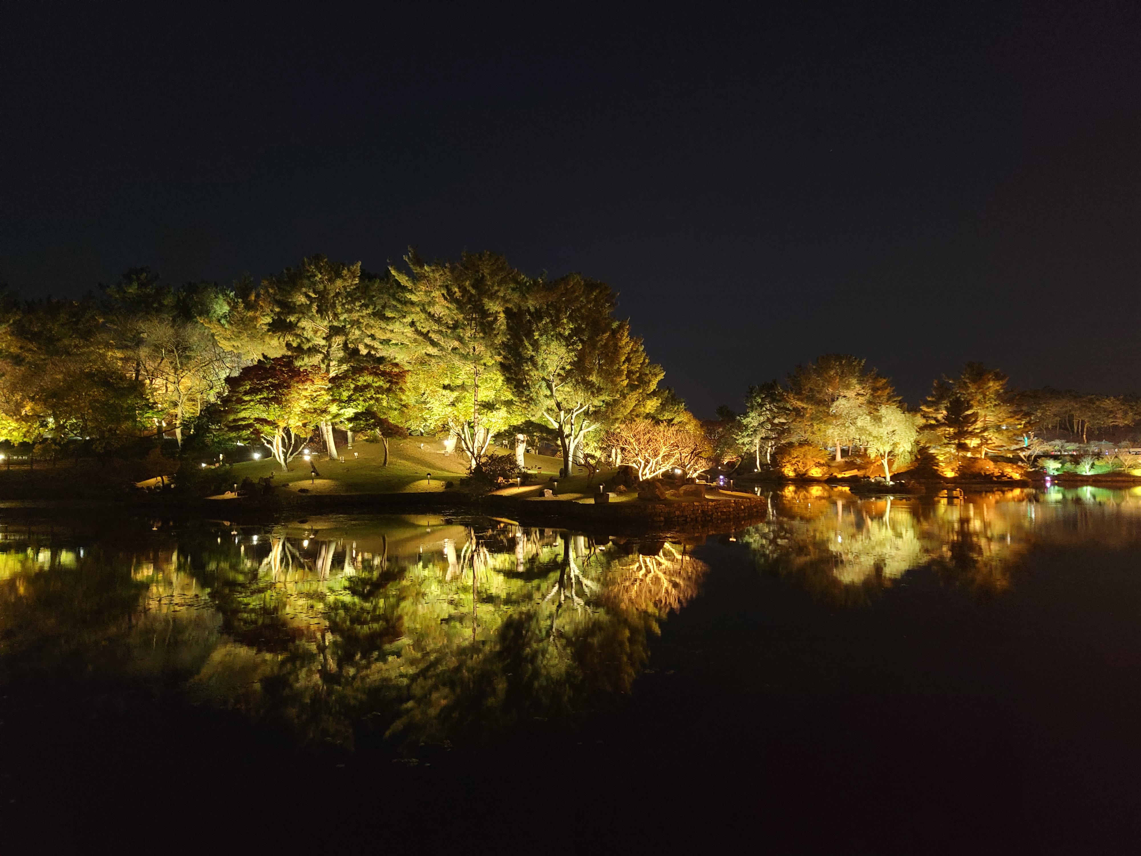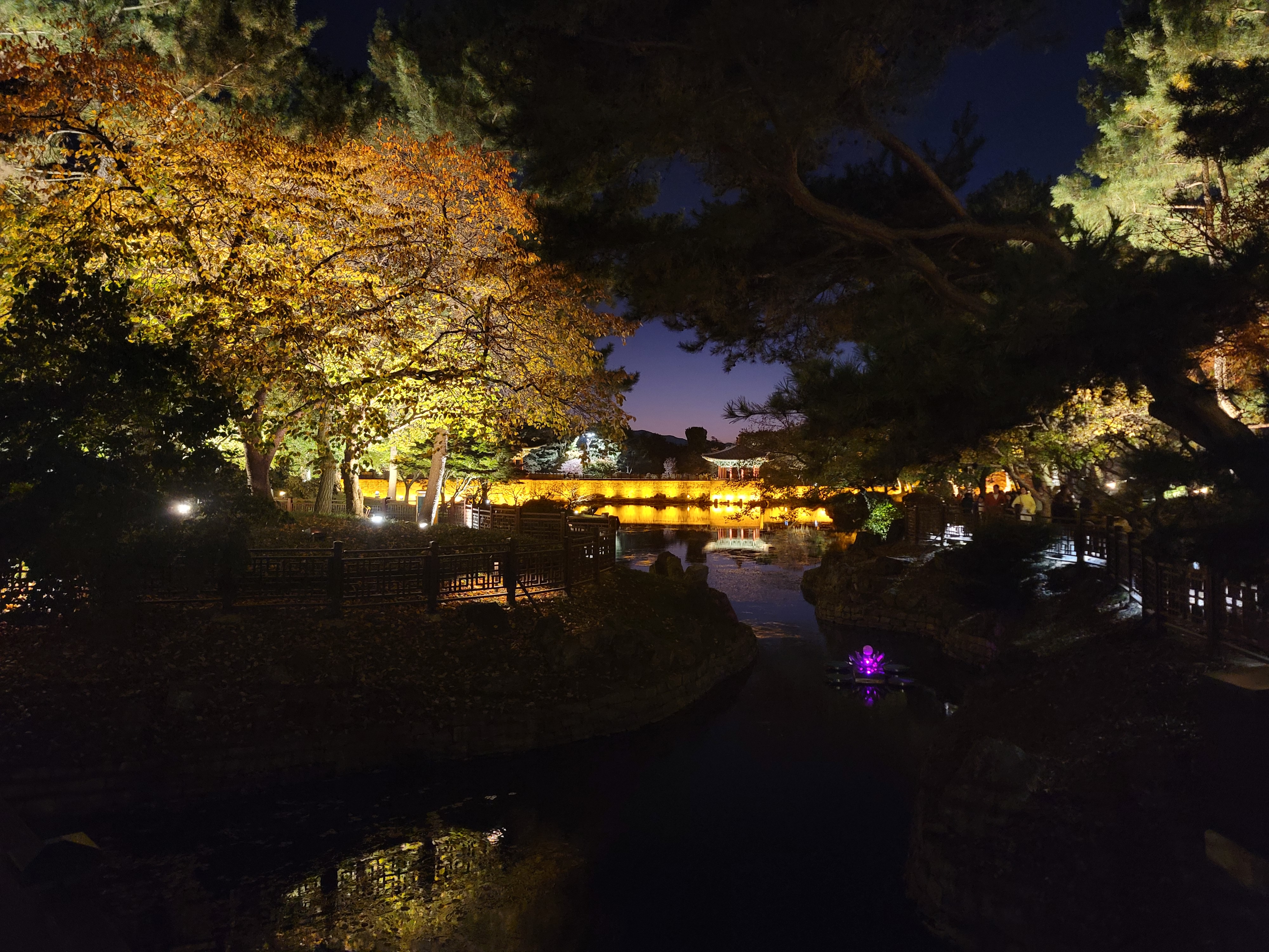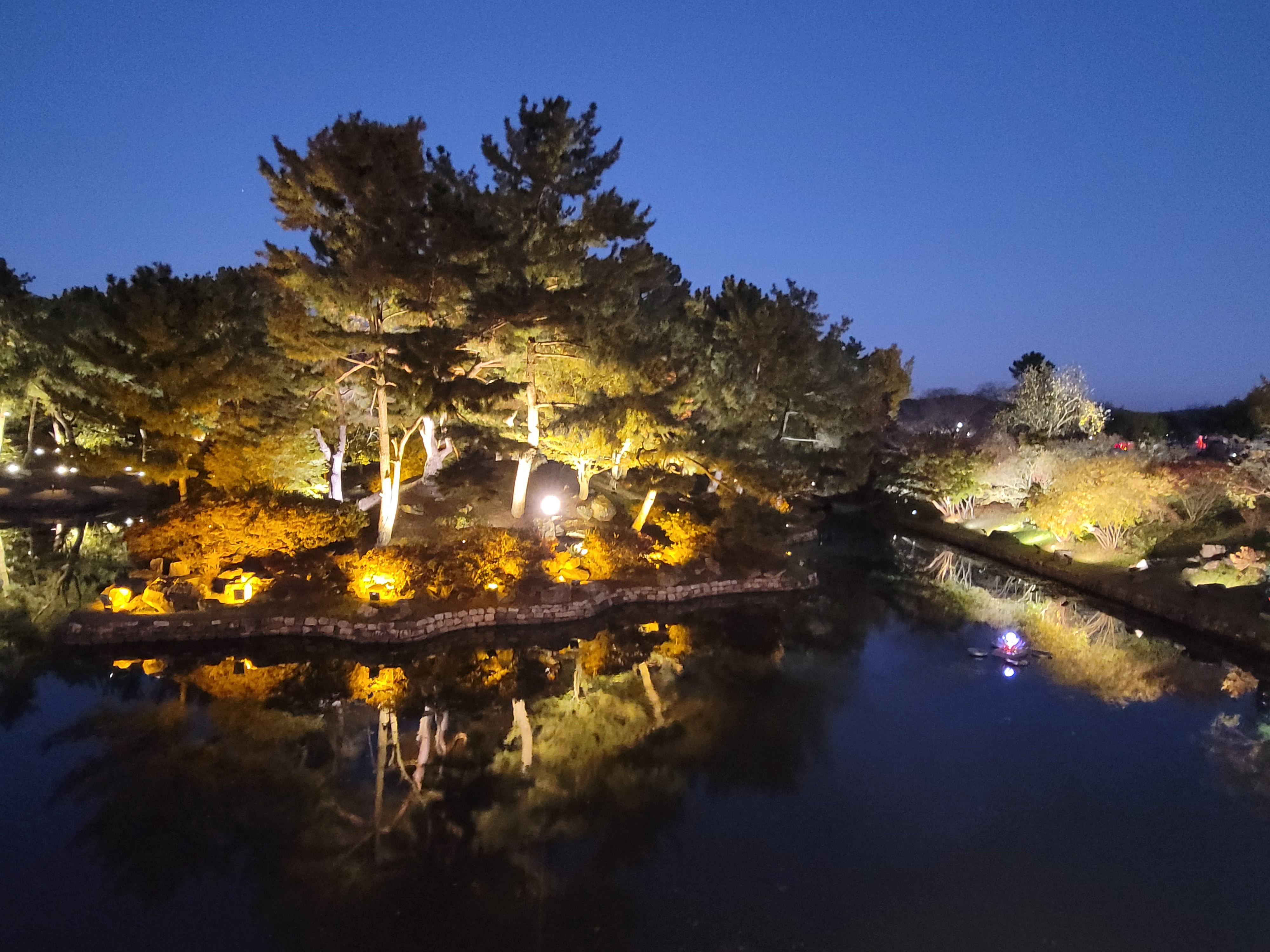 건물들에도 연못을 둘러싼 나무들에도 불빛이 가득하네요.