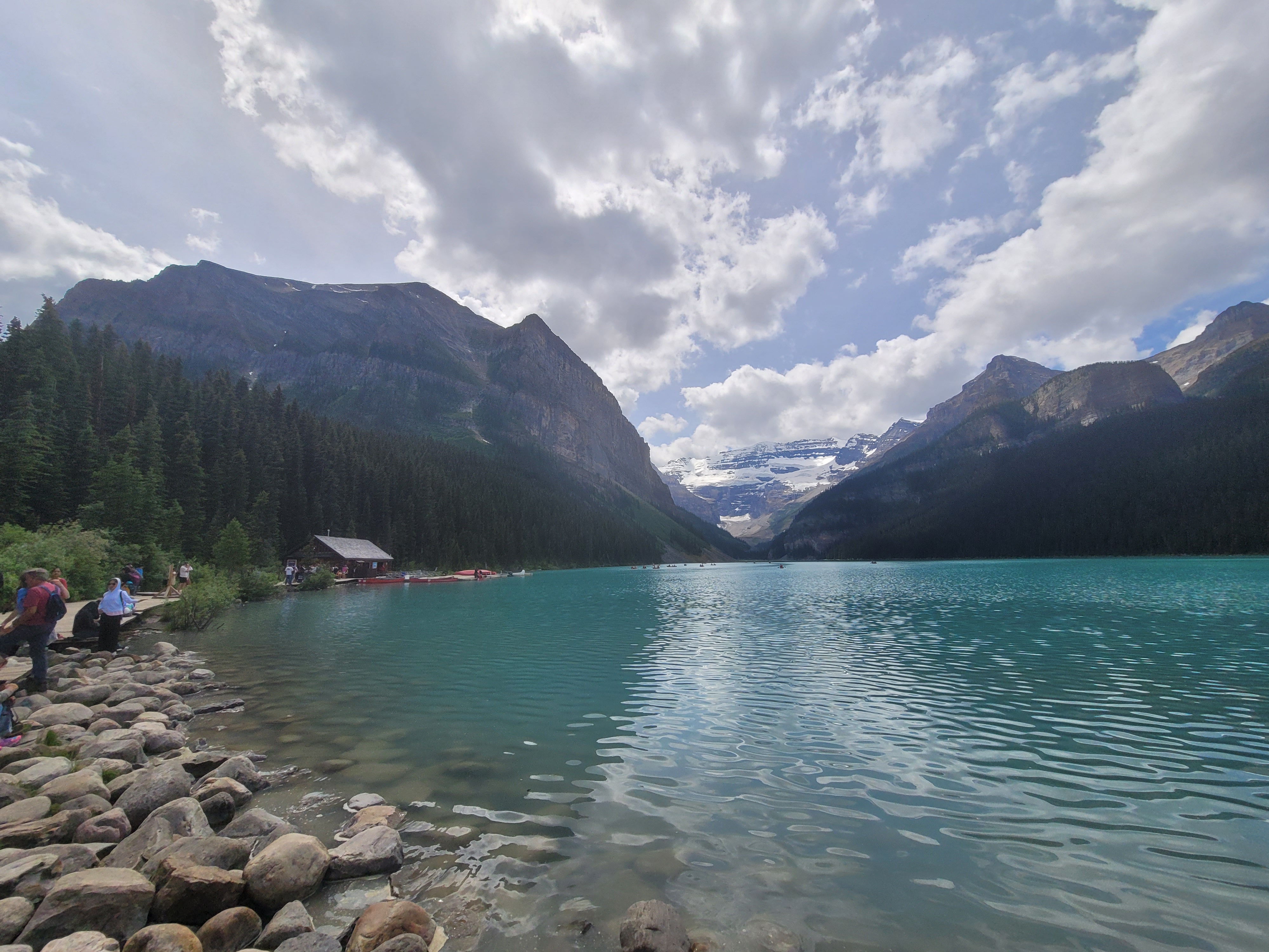 캐나다에서 가장 아름다운 호수 중 하나인 레이크 루이스 호숫가,